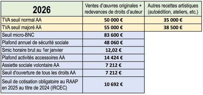 - Seuil TS = 10 692 € (un artiste-auteur qui a déclaré en 2025 au moins 10 692 € de droits d’auteur en TS doit cotiser au RAAP)