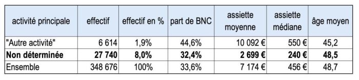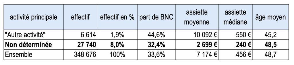 Il est pour le moins surprenant que des « activités principales » non déterminées puissent concerner 32,4 % d’AA en BNC (alors qu’ils ont tous l’obligation de renseigner cette information) et que l’assiette moyenne soit supérieure à 150 SMIC horaire (1 690,50 € en 2023). Il s’agit d’anomalies.
