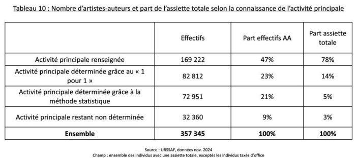 En revanche, les données communiquées par l’URSSAF et par le DEPS (Département des études, de la prospective, des statistiques et de la documentation du ministère de la Culture) concernent les artistes-auteurs et autrices en 2023.