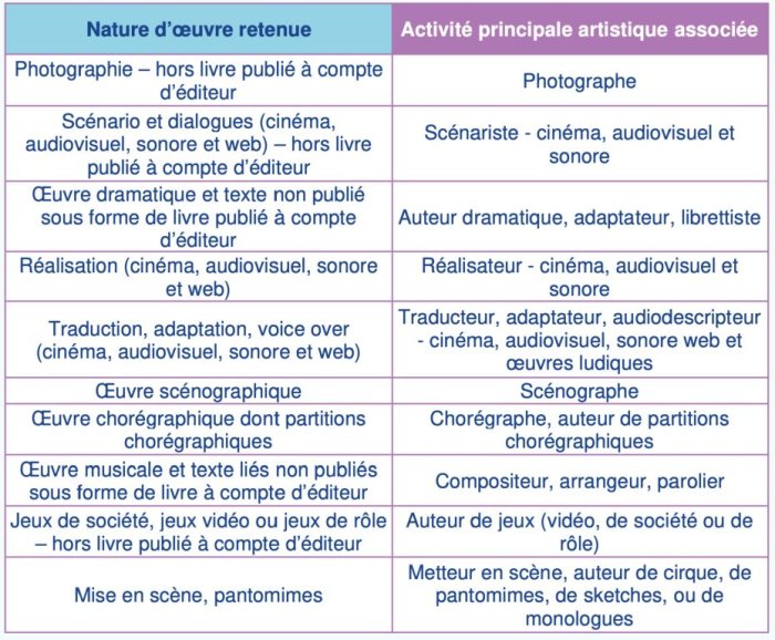 Les « œuvres dramatiques », les monologues, les sketches, les paroles de chansons… peuvent aisément correspondre à une activité principale d’écrivain. Les auteurs d’œuvres scénographiques peuvent ne pas se définir comme des « scénographes » mais comme des graphistes, des designers d’espace… Les « natures d’œuvre » telles que les « réalisations (cinéma, audiovisuel, sonore et web) » et les jeux sont des œuvres de collaboration, éventuellement composites, elles peuvent concerner divers AA dont les professions ou « activités principales » relèvent du domaine de l’image, de l’écriture ou du son…