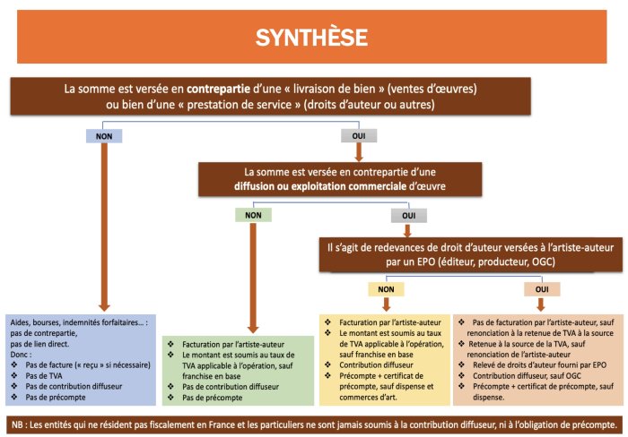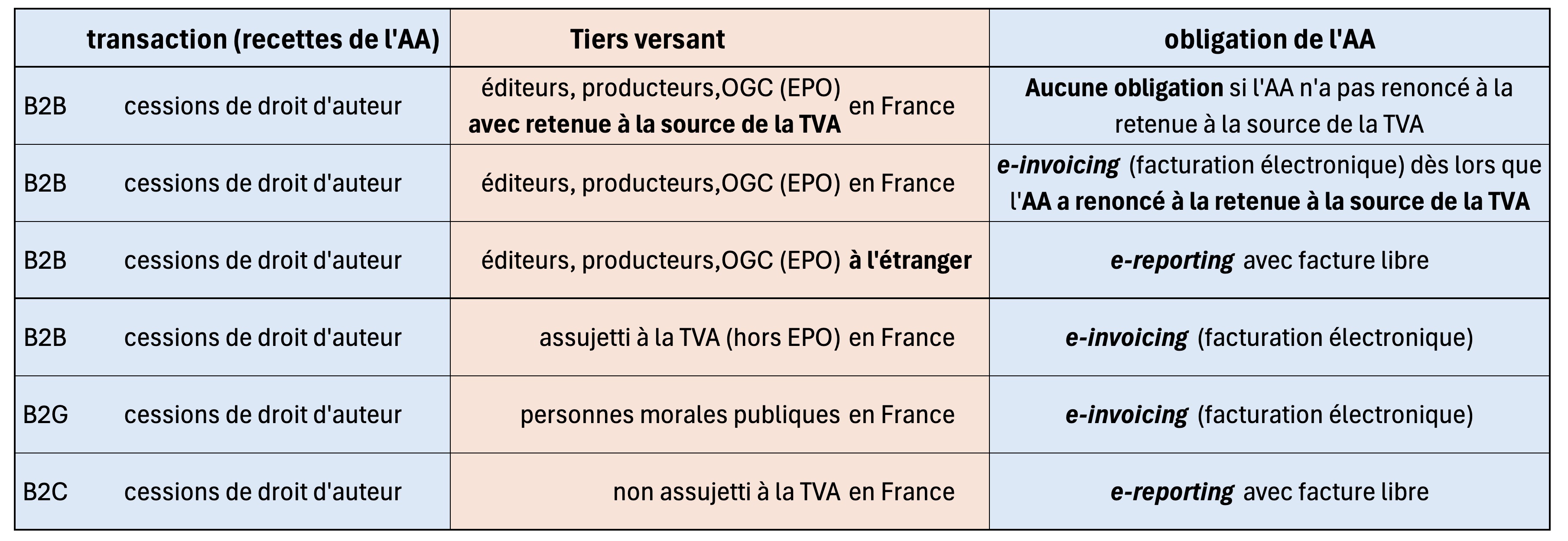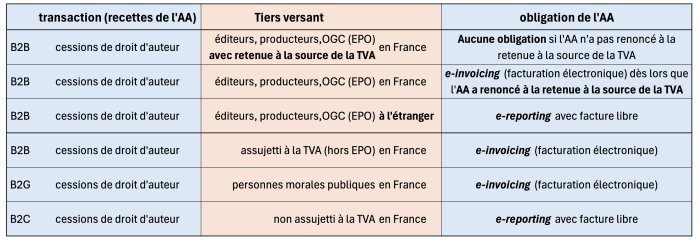 Rappel : les redevances de droits d’auteur sont classées en « prestation de service » par l’administration fiscale et sont dans le champ d’application de la TVA. Les AA en franchise en base de TVA sont concernés par la réforme de la facturation électronique.
