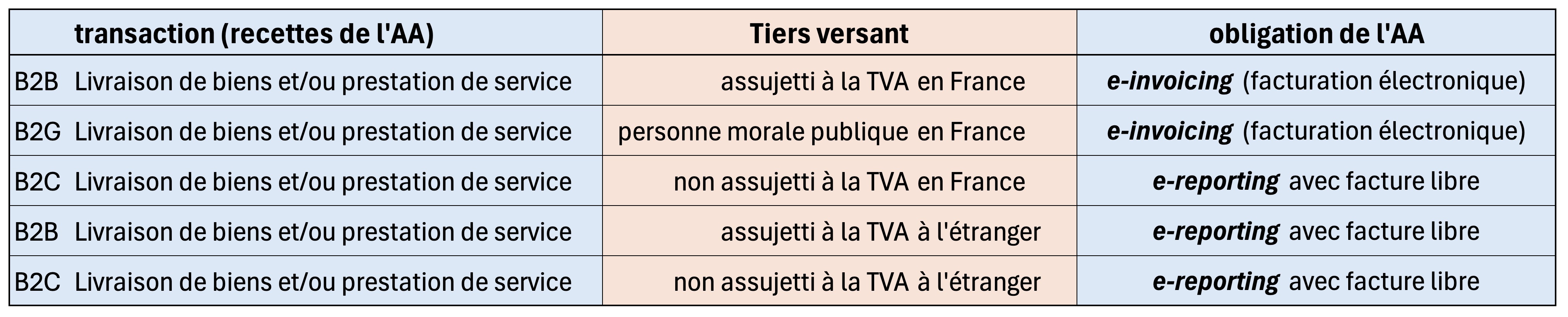 Ainsi les obligations respectives de facturation électronique (e-invoicing) et de rapport électronique (e-reporting) dépendent non seulement de la nature juridique de la recette (sans ou avec contrepartie : « livraisons de bien » ou « prestations de services ») mais également de la nature du tiers versant (débiteur ou payeur).