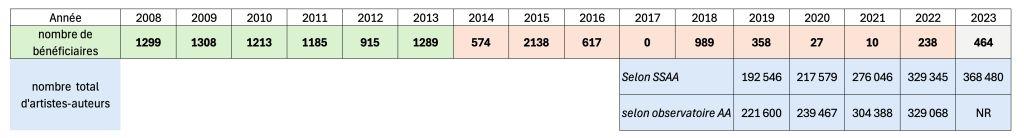 Remarque : l’absence de CA d’avril 2014 à février 2023 a engendré un effondrement de l’aide sociale aux artistes-auteurs, et donné lieu à des reports budgétaires qui se sont accumulés. En conséquence, actuellement, les fonds disponibles sont suffisants pour répondre aux besoins des deux aides règlementaires.