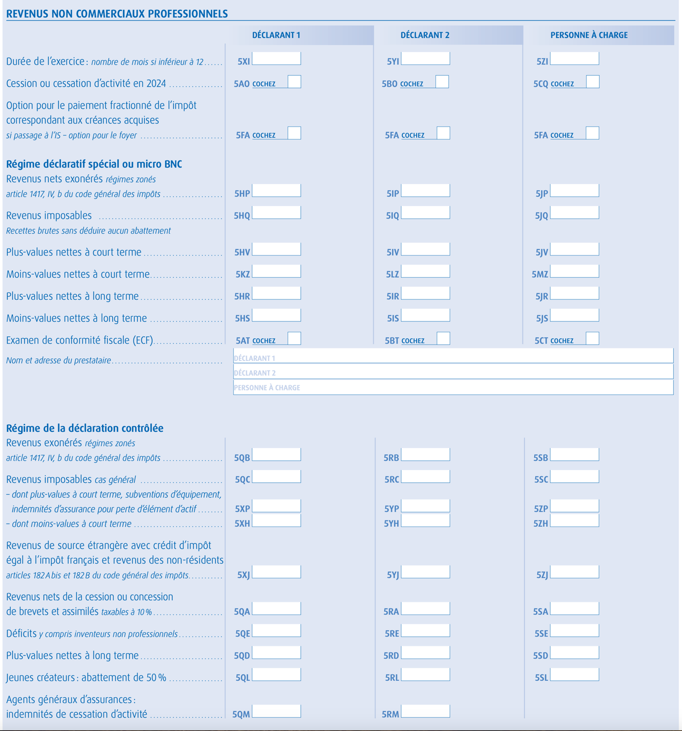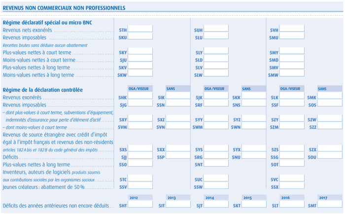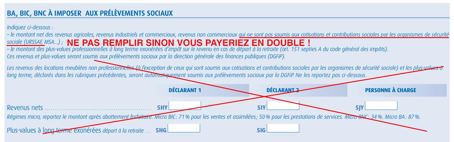 NB : Si et seulement si, ce revenu non professionnel n’est pas soumis aux cotisations sociales par les organismes sociaux, il doit aussi être indiqué dans la partie relative aux « BA, BIC BNC à imposer aux prélèvements sociaux » du formulaire de la déclaration 2 042 C pro, dans les cases 5HY, 5IY, 5JY. Dans ce cas, ce sont les impôts qui collectent les cotisations sociales à un taux global de 17,20 %.