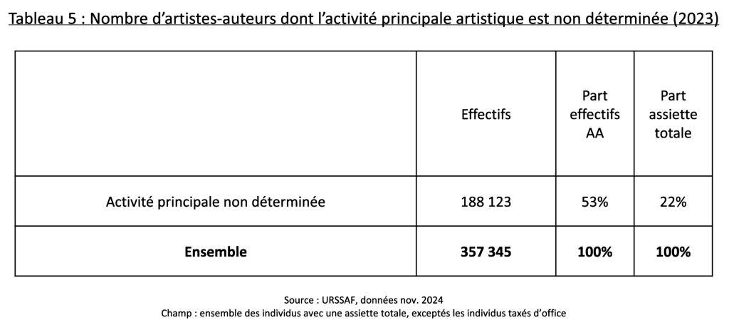 De plus, le DEPS note qu’en cas de pluralité d’œuvres : « l’activité artistique a été déduite automatiquement de la nature d’œuvre la plus rémunératrice ». Et l’URSSAF précise : « Quand un artiste-auteur a déclaré plusieurs natures d’œuvres et que celles-ci ne peuvent pas être associées à une seule profession sans équivoque, la nature d’œuvre la plus rémunératrice est retenue. Grâce à ce traitement, l’activité principale d’environ 82 000 non déterminée artistes-auteurs a pu être déterminée, soit un peu plus de 23 % du total ».